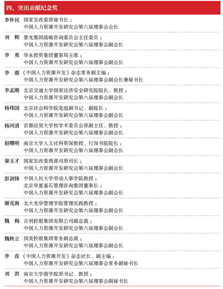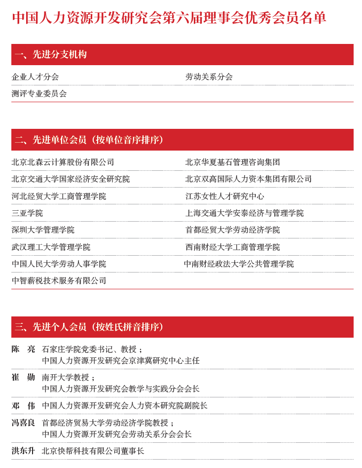 在中国人力资源开发研究会第六届理事会期间,各会员单位和广大会员努力创造人力资源开发事业和研究会工作新局面,涌现出了一批积极进取、无私奉献的先进集体和优秀会员。为了表彰先进、树立典型,进一步激发广大会员单位和会员的积极性、创造性,按照坚持标准、上下结合的原则,经广泛征求意见,研究会决定对企业人才分会等3家分支机构、中国人民大学劳动人事学院等15家单位会员、陈亮等51位个人会员给与表彰。希望受到表彰的先进集体和个人珍惜荣誉,再接再厉,在各项工作中取得新的成绩。