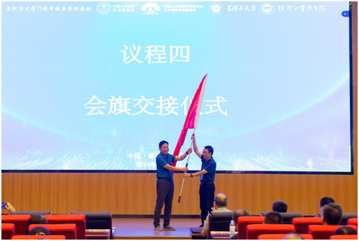 在会旗交接仪式环节,年会承办单位石河子大学经济与管理学院院长王力向下一届承办单位西南民族大学商学院院长康杰移交了会旗。