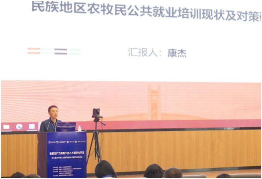 西南民族大学商学院院长康杰作题为《民族地区公共就业培训现状及提升策略》的主旨演讲,旨在探讨民族地区农牧民公共就业培训的现状,并提出改进对策。